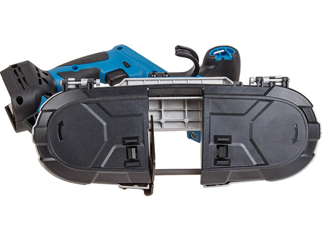 Аккумуляторная ленточная пила применяется в резке стали, также подходит и для других материалов: медь, пластмасса, алюминий, создавая при этом точный и чистый рез без окалин, требующий лишь минимальную обработку. Обладает бесщеточным двигателем для повышенной производительности. Присутствует подсветка рабочей зоны, дополнительная рукоятка, а также шестиступенчатая регулировка скорости вращения пильного полотна. Ленточная пила оснащена кнопкой защиты от случайного включения. Смена пильного полотна осуществляется без использования вспомогательных устройств ввиду присутствия дополнительного рычага натяжения. Рукоятки данной модели имеют дополнительное резиновое покрытие. Присутствует подвесной крюк для более удобной переноски, а также высотных работ.