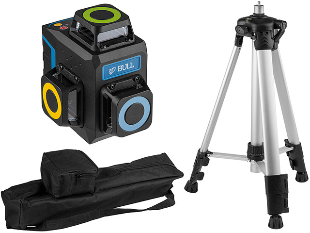 Компактный нивелир отличается зеленым диодом, позволяющим работать в условиях высокой освещенности. Лазерный нивелир BULL оснащен немецкими LD лазерами компании OSRAM. Имеет проекцию трех плоскостей по 360 градусов. Корпус прорезинен, что выполняет противоударную функцию. Может быть использован как внутри помещения так и вне помещения для измерения до 60 м с приемником. Управление может осуществляться дистанционно за счет специального пульта. Товар поставляется со штативом 1,2 м.